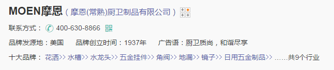 美国摩恩公司Moen是水龙头、厨盆、卫浴五金配件的专业制造公司之一。摩恩的系列产品种类齐全,包括龙头、厨盆、挂件、浴室家具等。适应于各种场所的需要,广泛应用于住宅、酒店、别墅、公寓、商务办公楼及各类公用建筑。摩恩产品以其精湛的技术,完善的售后服务而倍受世界各地用户的偏爱,并享有较高的声誉。