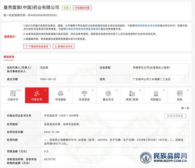 近日,曼秀雷敦(中国)制药有限公司新增行政处罚信息,因生产、销售不符合国家《化妆品卫生标准》的化妆品被中山市市场监督管理局处罚,没收男士润唇膏SPF15-爽型1427支,没收违法所得495711.2元。