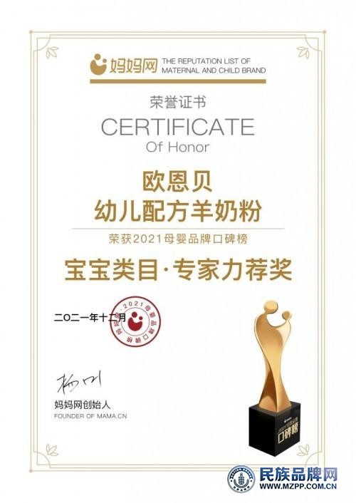 2021年,随着奶粉新国标、“三孩”等一系列政策的相继出台,我国相关监管部门对奶粉市场提出了更加严格的要求,国产奶粉的发展也从质量安全逐步上升到质量提升的新阶段。欧恩贝作为国产奶粉的代表品牌,立足产品质量安全,坚持卓越品质,凭借过硬的产品实力,受到越来越多中国妈妈的青睐,荣获Mama.com 2021母婴品牌口碑榜宝宝类和专家推荐奖!为2021年画上圆满的句号。