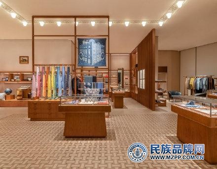 男女丝巾用木屏分割,视野清晰开阔。爱马仕标志性的书印标志被放置在入口前的地面上,与上方希腊风格的琉璃瓦顶灯遥相呼应。