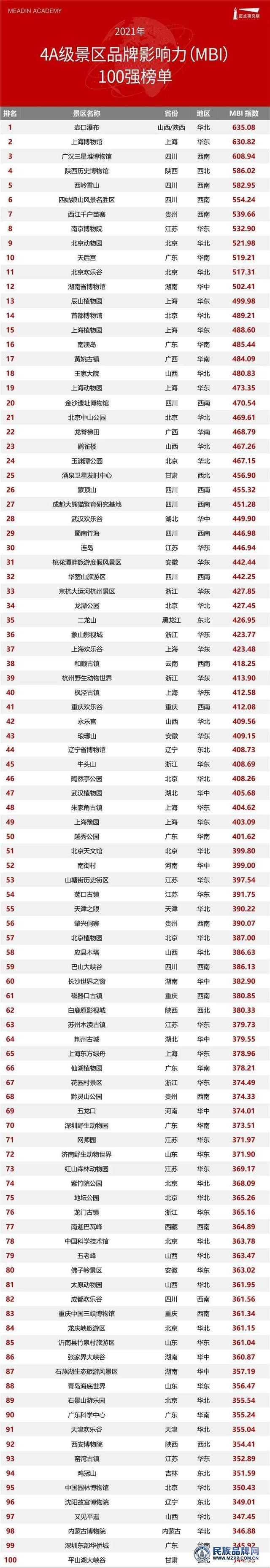 以下是麦点研究院独家发布的“2021年4A级景区品牌百强榜”。壶口瀑布、上海博物馆、广汉三星堆博物馆位列年度榜单前三,陕西历史博物馆、西陵雪山、四姑娘山景区、西江千户苗寨、南京博物馆、北京动物园、天后宫位列榜单前十。